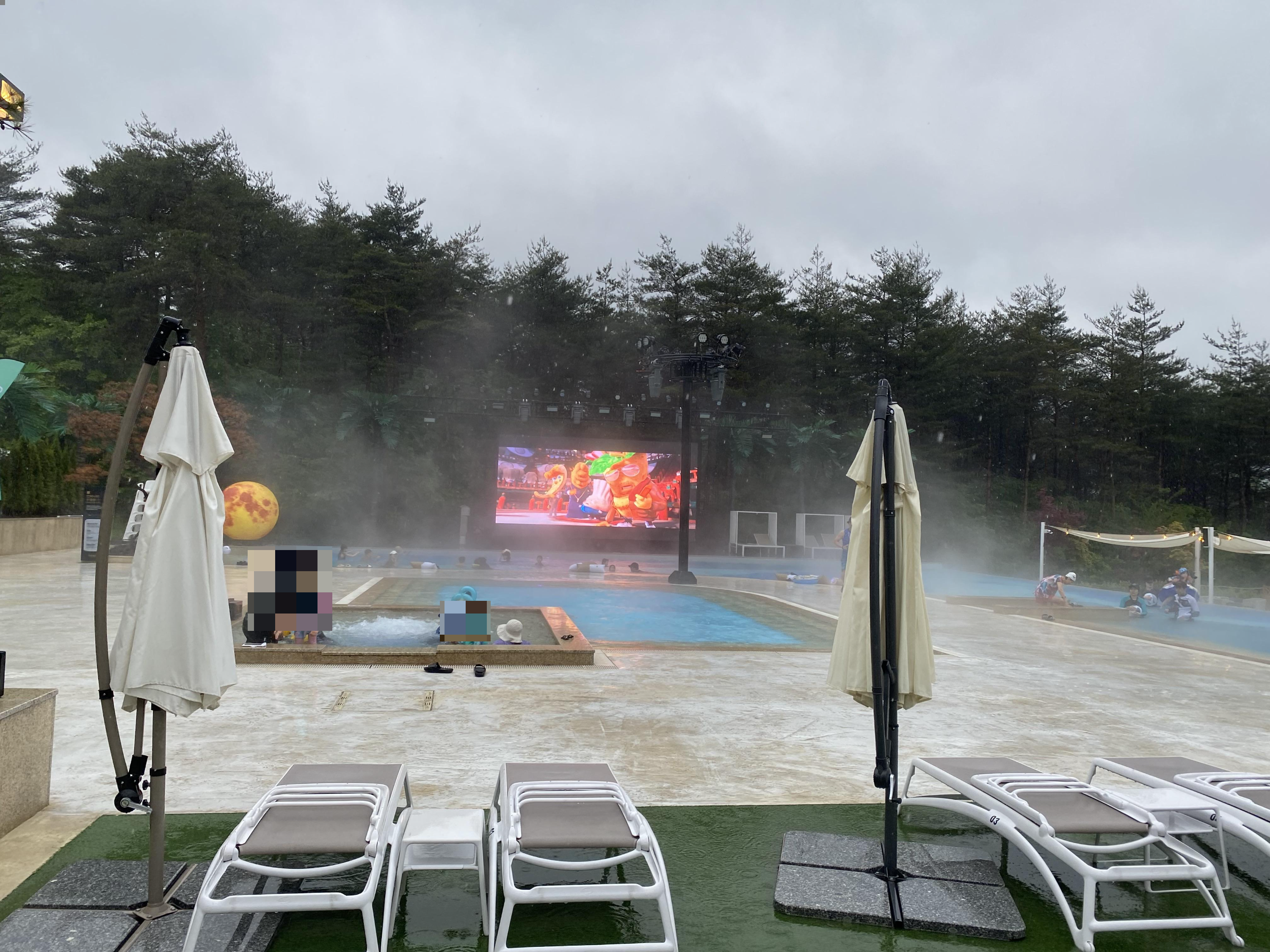 대형스크린이 있어서 어린이날을 맞이하여 영화를 상영했습니다. 그래서 영화를 보면서 수영을 즐길 수 있었지만 저는 좀 아쉬웠습니다. 왜냐하면 영화는 집에서도 볼 수 있는데 굳이 야외수영장까지 와서 영화를 볼 필요가 있나 싶어서입니다.