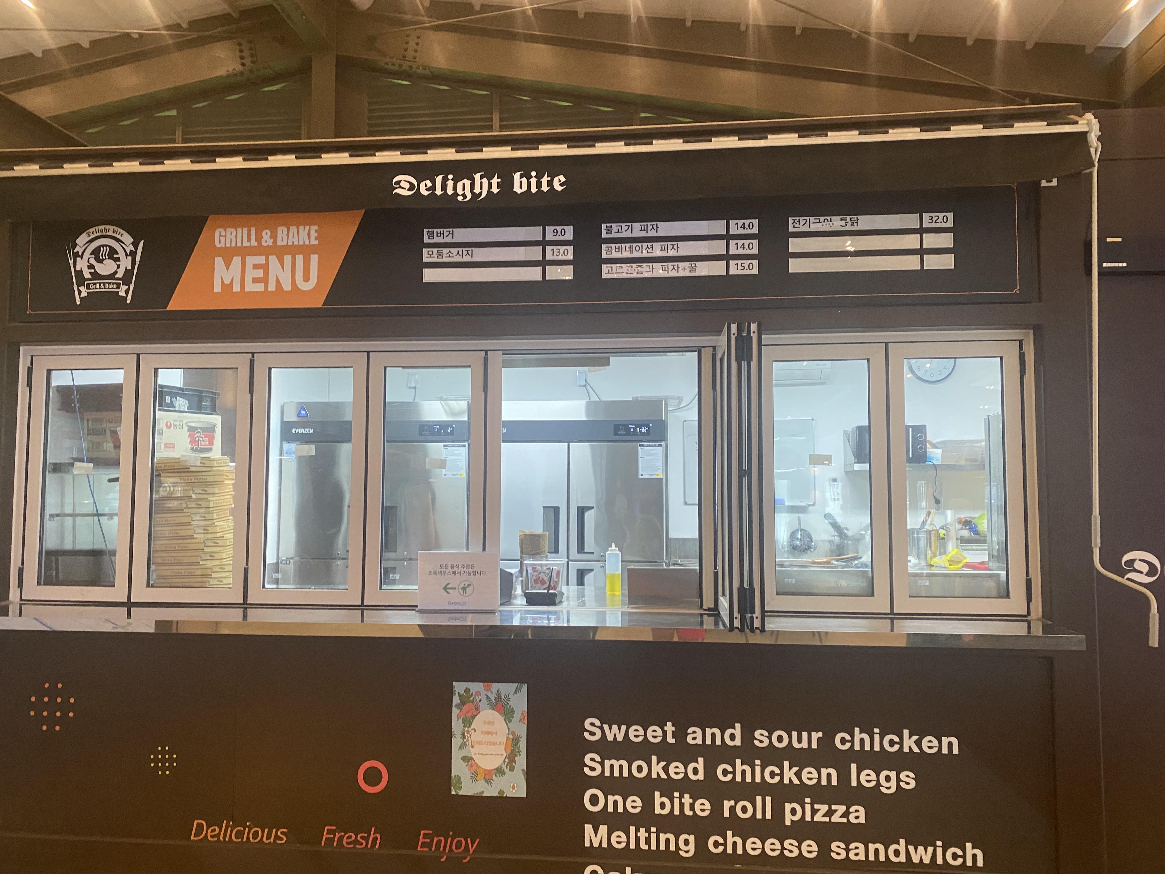 푸드코트에는 햄버거, 소세지, 피자, 핫도그, 스테이크, 떡볶이, 우동, 돈까스, 커피 등을 판매하고 있습니다.