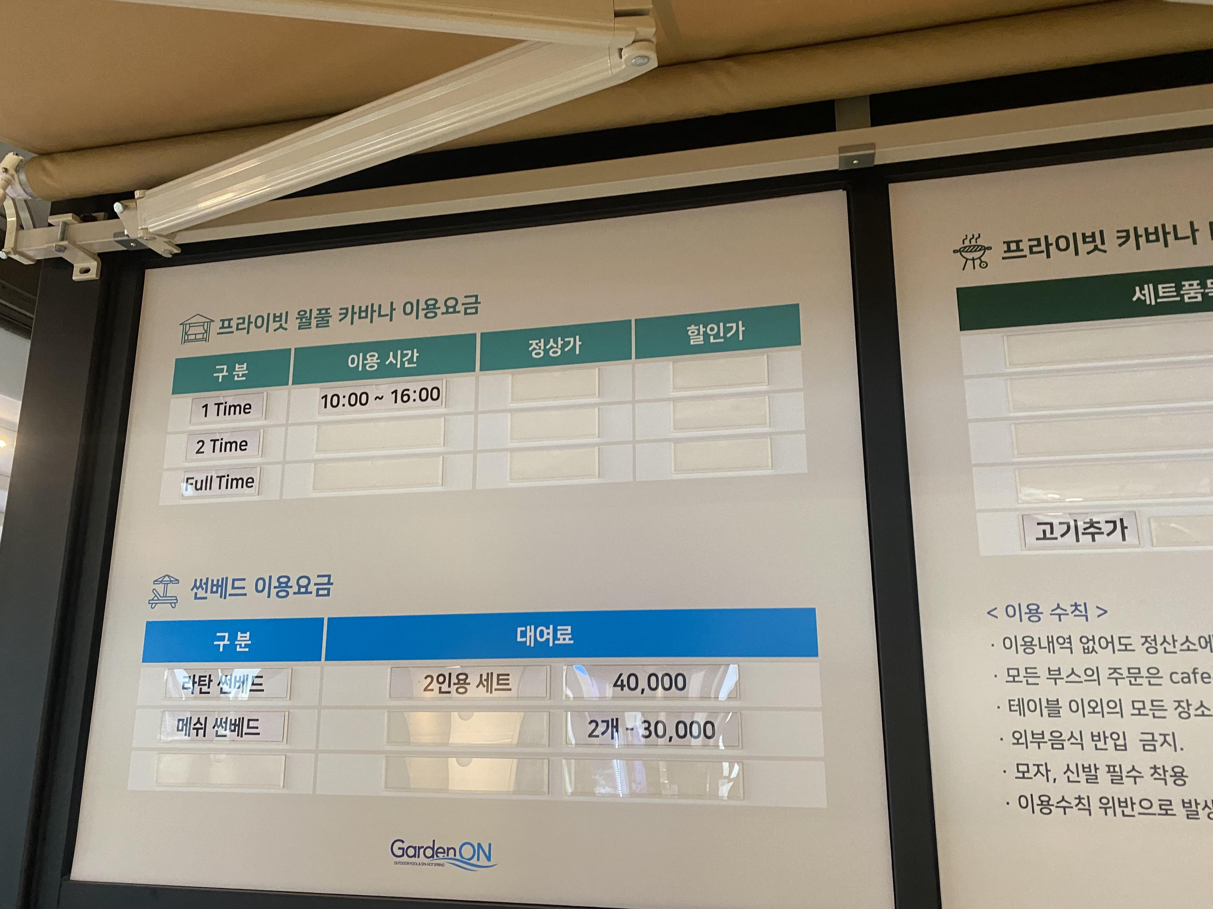 프라이빗 월풀 카바나, 썬베드 이용요금