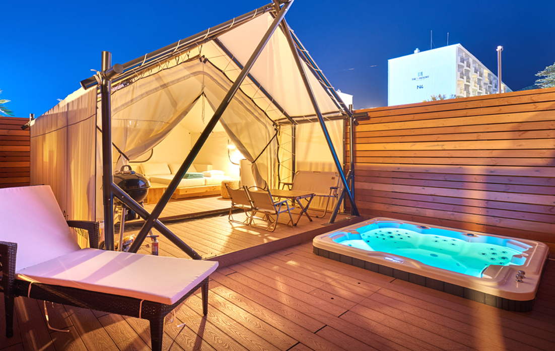 프라이빗 월풀 카바나는 수영장 내 개별텐트에서 글램핑을 즐길 수 있는 곳으로 프리미엄 공간입니다. 안에서 바베큐와 수영장을 즐길 수 있는 곳이어서 이용일 하루 전까지만 예약이 가능합니다.