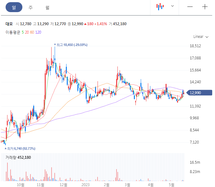 대모 일봉차트를 보시면 큰 변동성이 있은 후 긴 횡보구간을 거쳤습니다. 이에 대한 시간외단일가에서 상한가로 마감을 했지만 매물대가 있기 때문에 쉽게 돌파는 하기는 힘들거 같습니다.