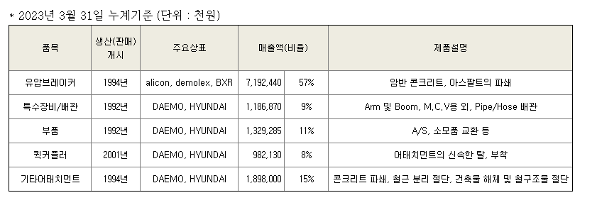 대모의 사업보고서 주요 제품 매출을 보면 유압브레이커가 57%의 비중으로 가장 많이 판매를 하고 있는 제품입니다.
