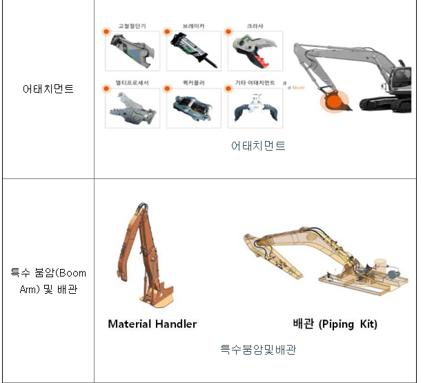 어태치먼트란 기계, 기구의 몸체에 설치하여 그 기계의 성능을 높이거나 향상시키는기계의 부속장치 전반을 의미합니다. 당사에서 생산하고 있는 굴삭기용 어태치먼트는 굴삭기에 탈부착하여 조작자가 원하는 기능을 부여하는 제품입니다.