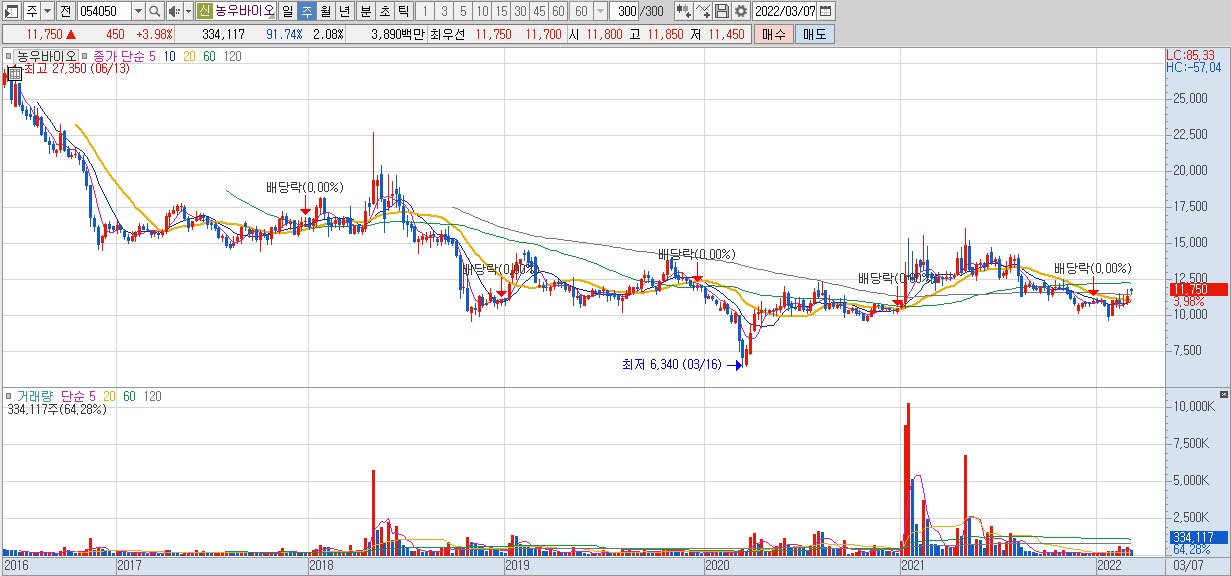농우바이오 주봉 차트를 보시면 2021년 거래대금이 활발하게 있은 후에