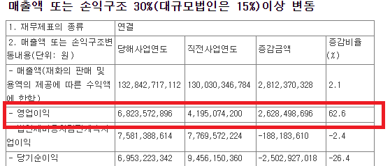 무려 영업이익이 전년대비 62%나 급증을 하면서 이익 개선의