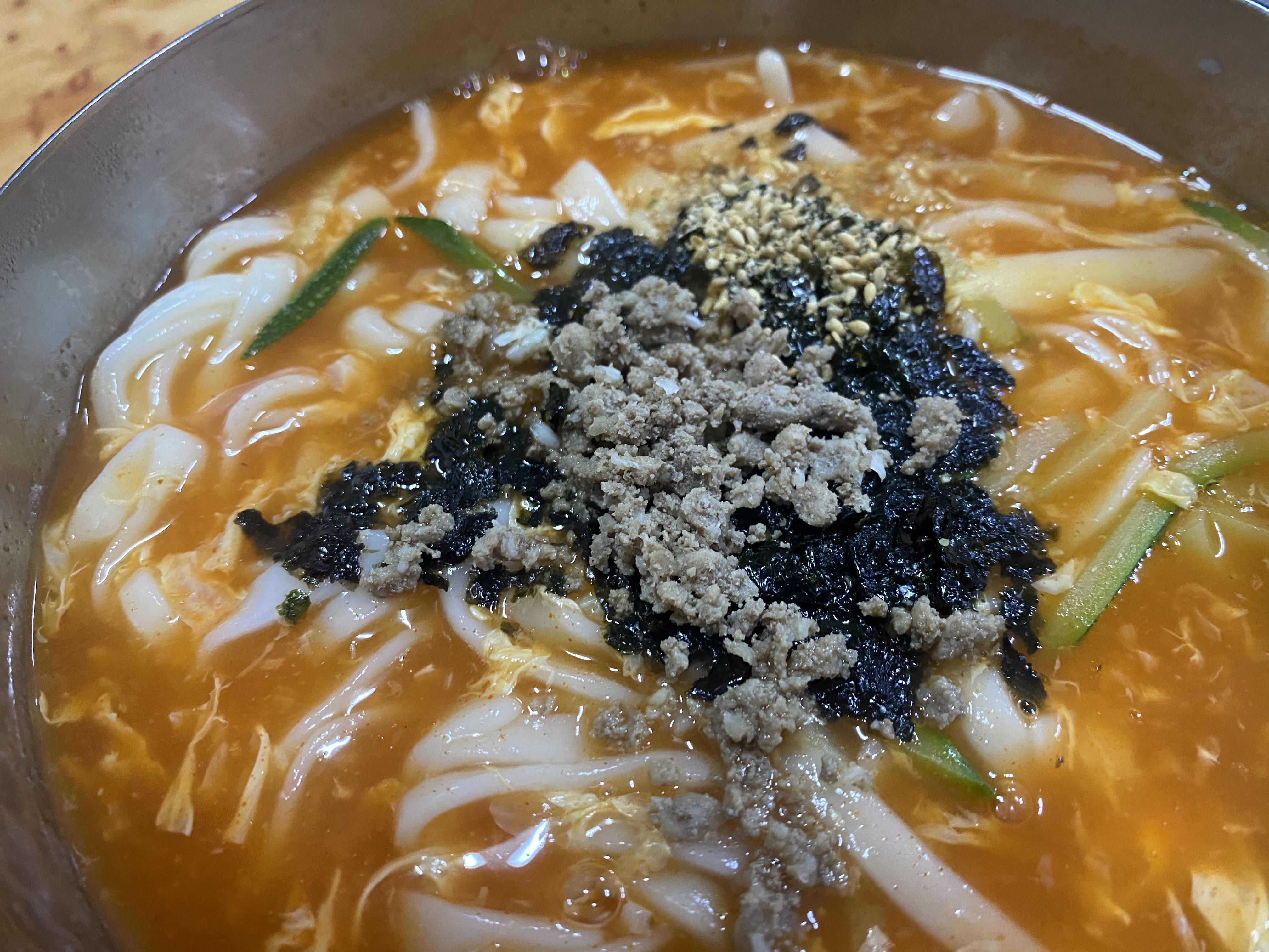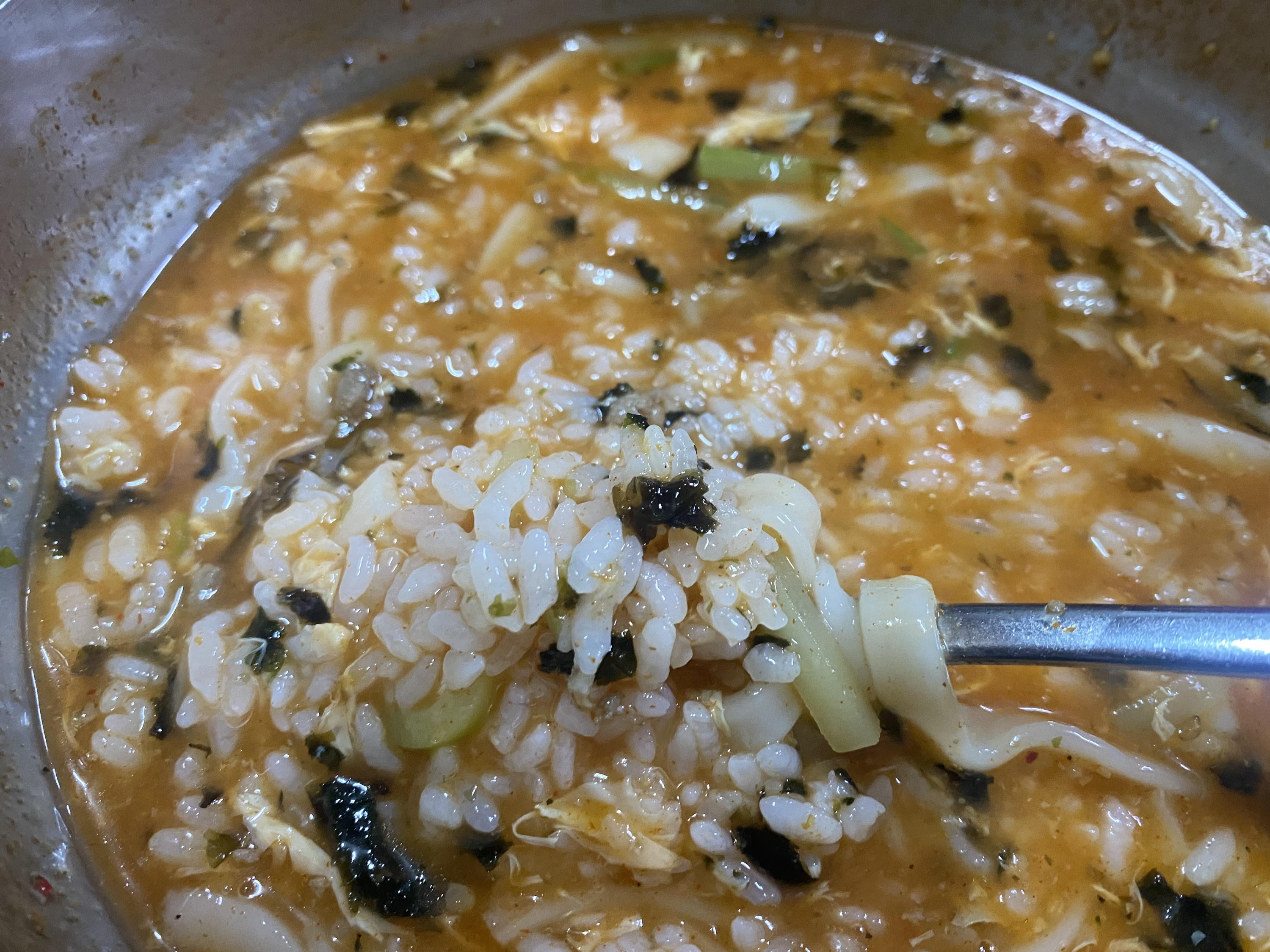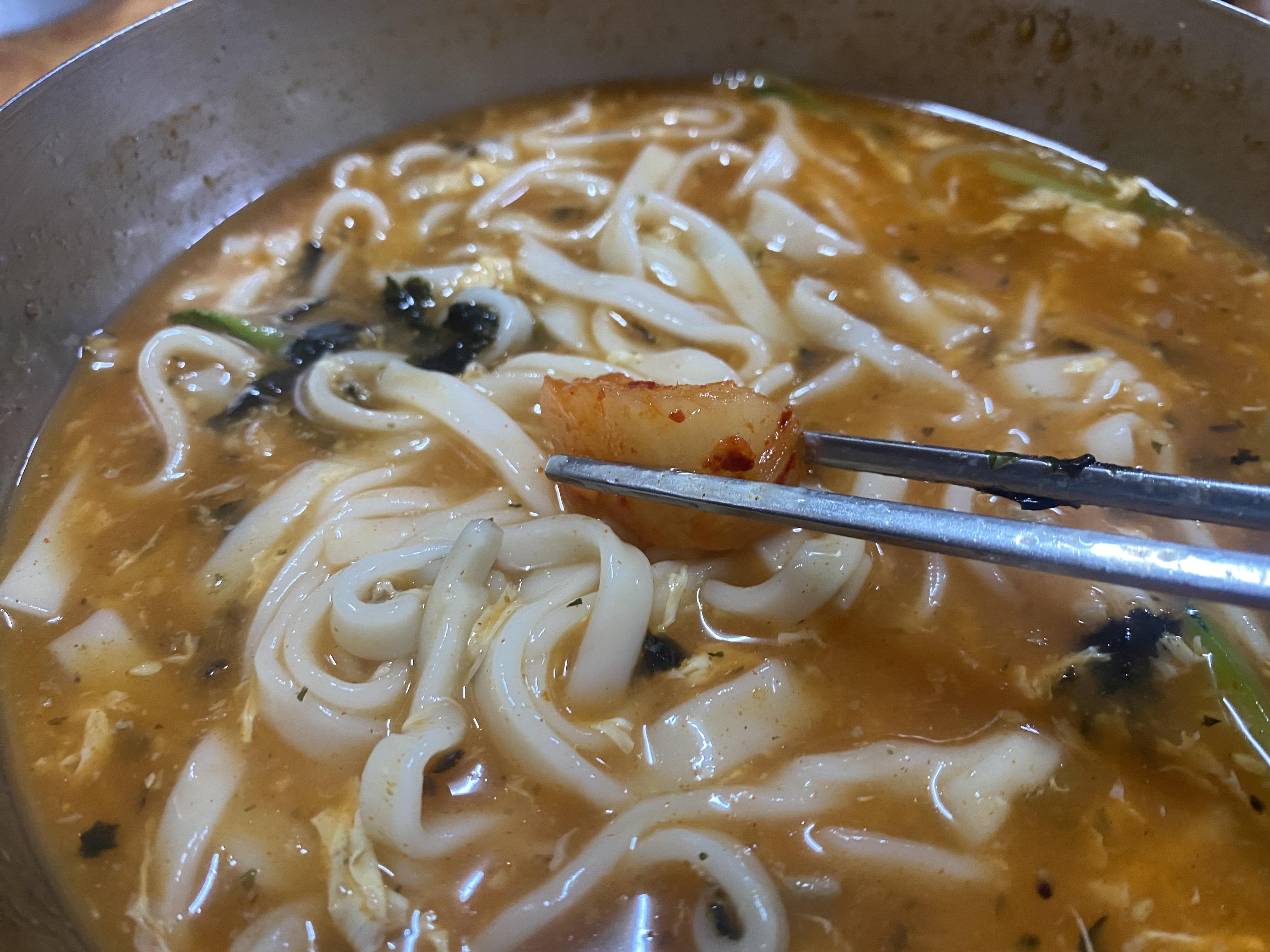 고추장국물에 칼국수면과 계란을 풀어서 걸쭉하게 만들어서 고소하고 얼큰한 맛입니다. 그 위에 고기고명과 김을 올려서 더욱 맛을 맛있게 만듭니다. 칼국수면을 직접 반죽을 해서 그런지 정말 쫄깃합니다.