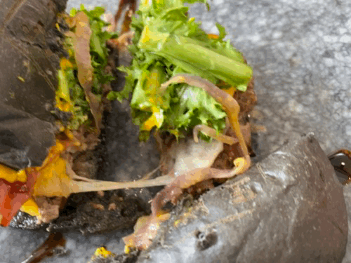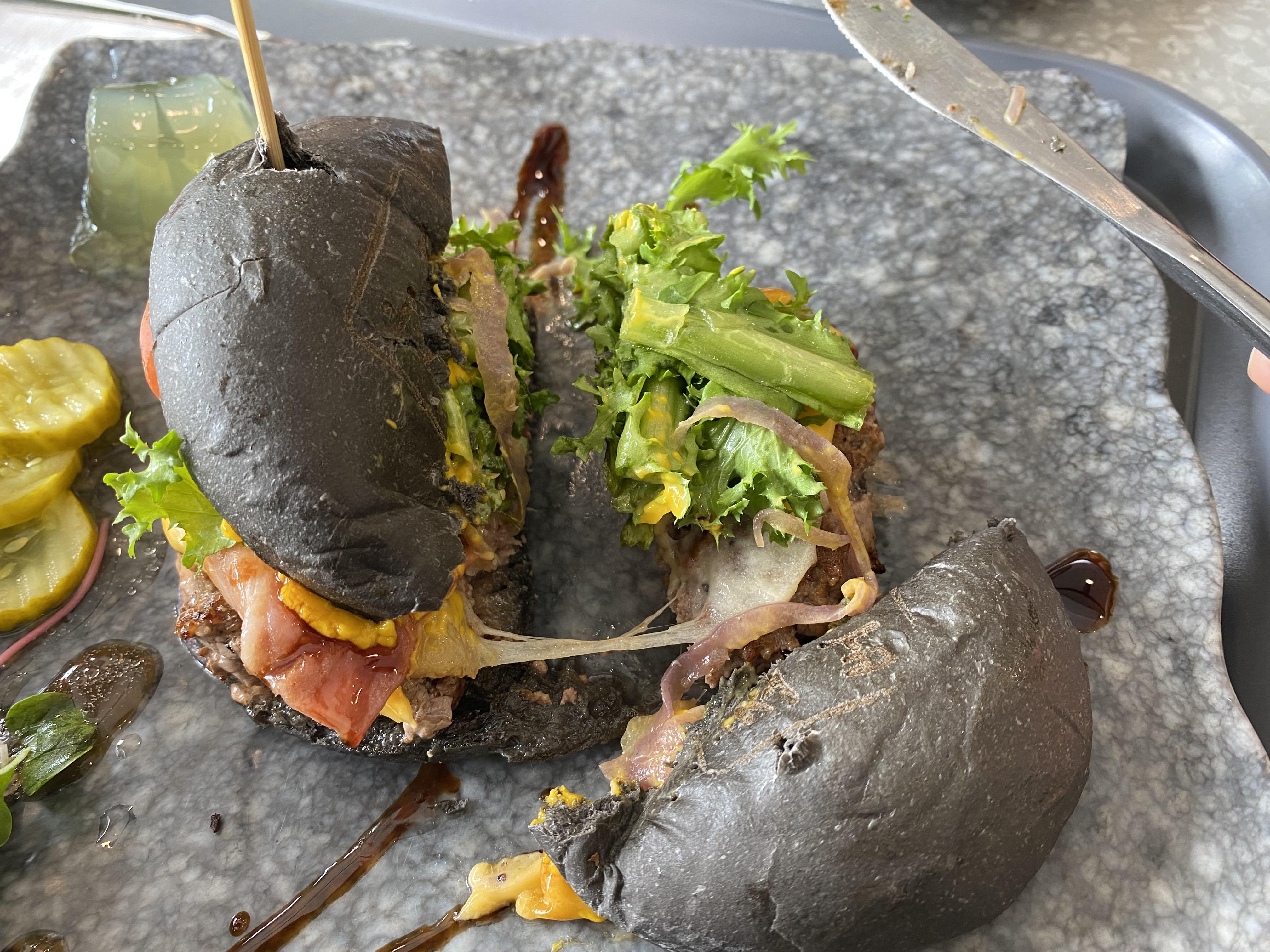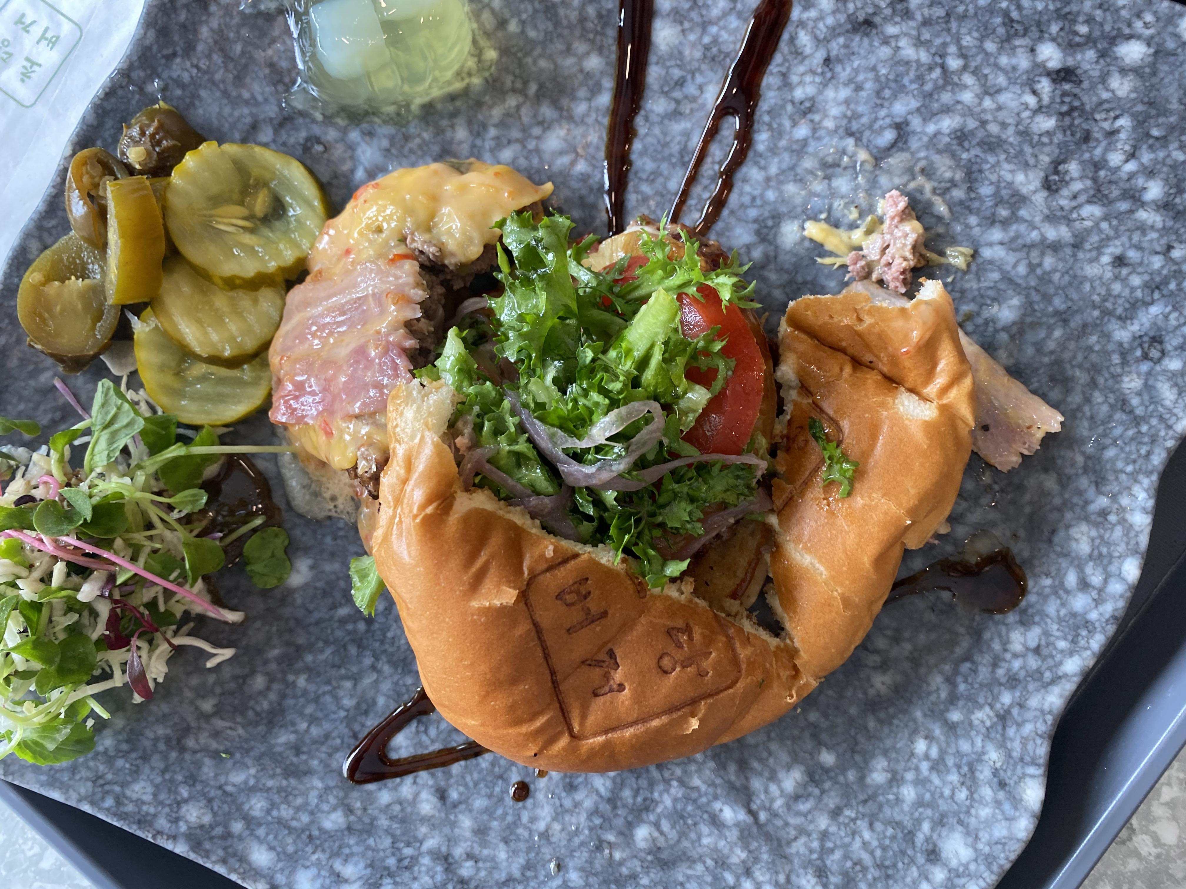 한입에 먹기에는 불편하기 때문에 반으로 자르거나 먹기 좋게 잘라서 먹어야 합니다. 한입 먹으면 버거소스와 패티 육즙이 나오기 때문에 이쁘게 먹는 건 포기해야 하지만 맛은 있었습니다.