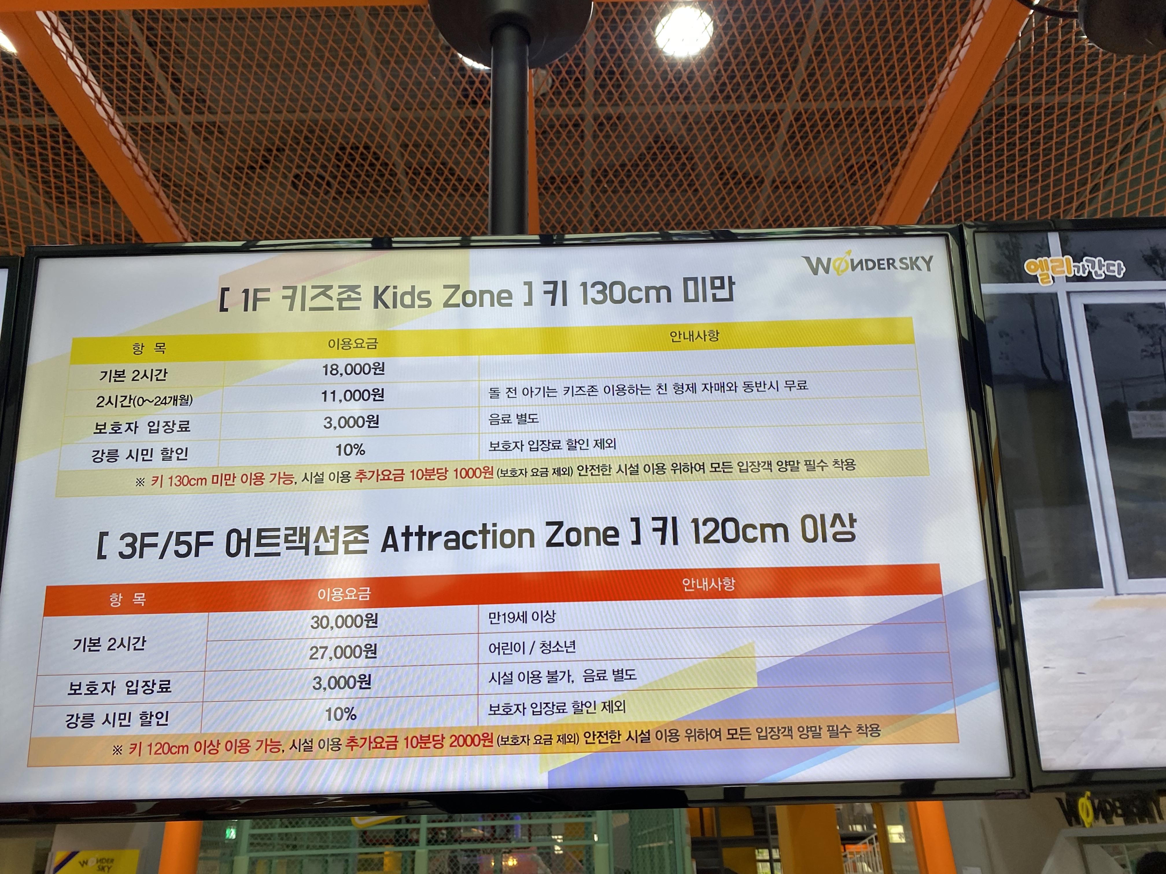 원더스카이는 키 130cm 기준으로 다르게 이용하실 수 있습니다. 1층은 영유아 아이들을 위한 키즈존으로 130cm 미만 아이들만 이용할 수 있는 곳이고, 3층과 5층은 어트랙션존으로 키 120cm 이상만 이용이 가능한 공간입니다.