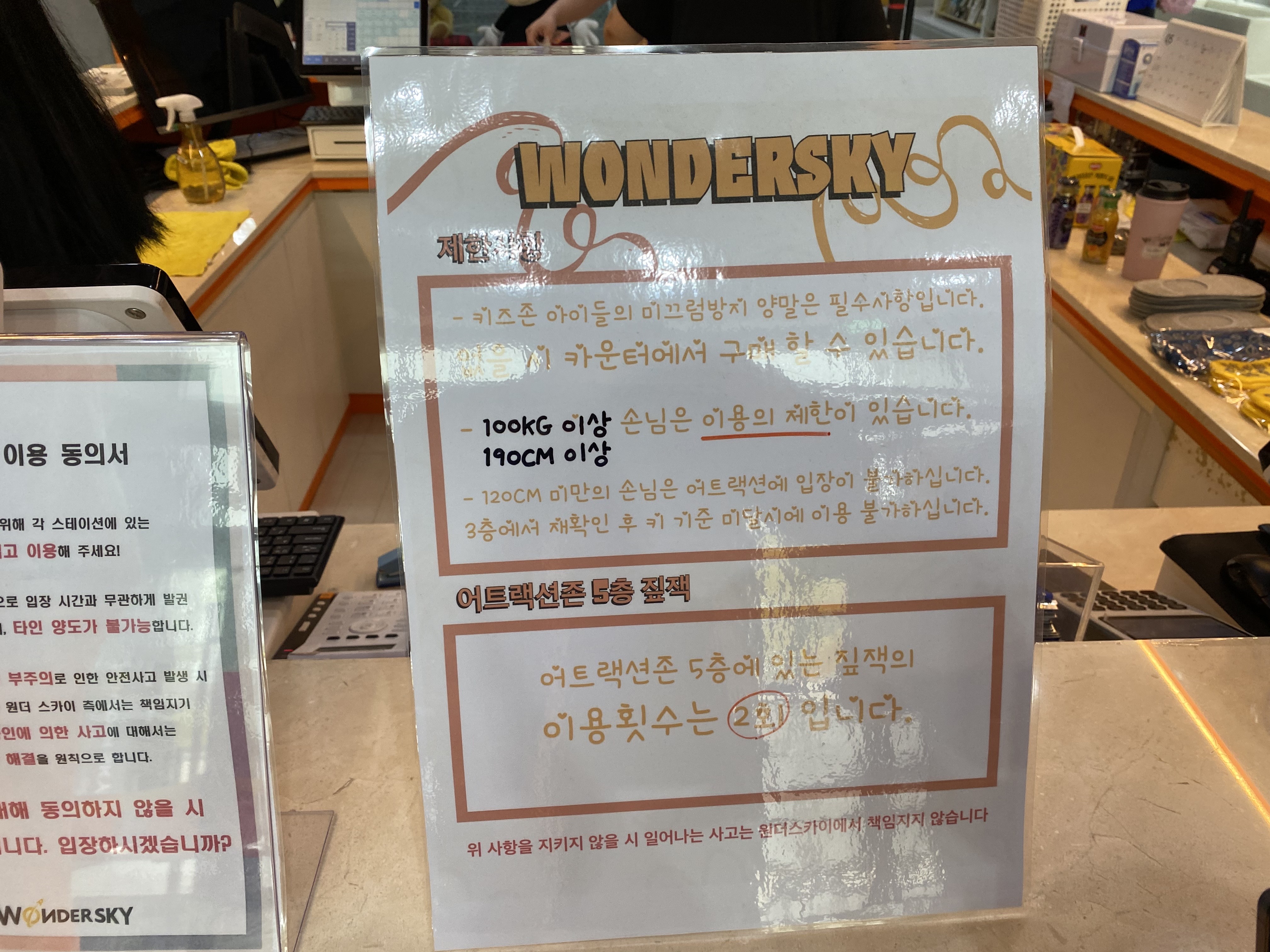 원더스카이는 100kg 이상 손님은 이용의 제한이 있다고 합니다. 다행히 저는 100kg는 안넘지만 간당간당해서 넘으면 이용을 못할 거란 생각에 속상한 마음이 들었습니다. 그래서 저는 이용을 안 했습니다.