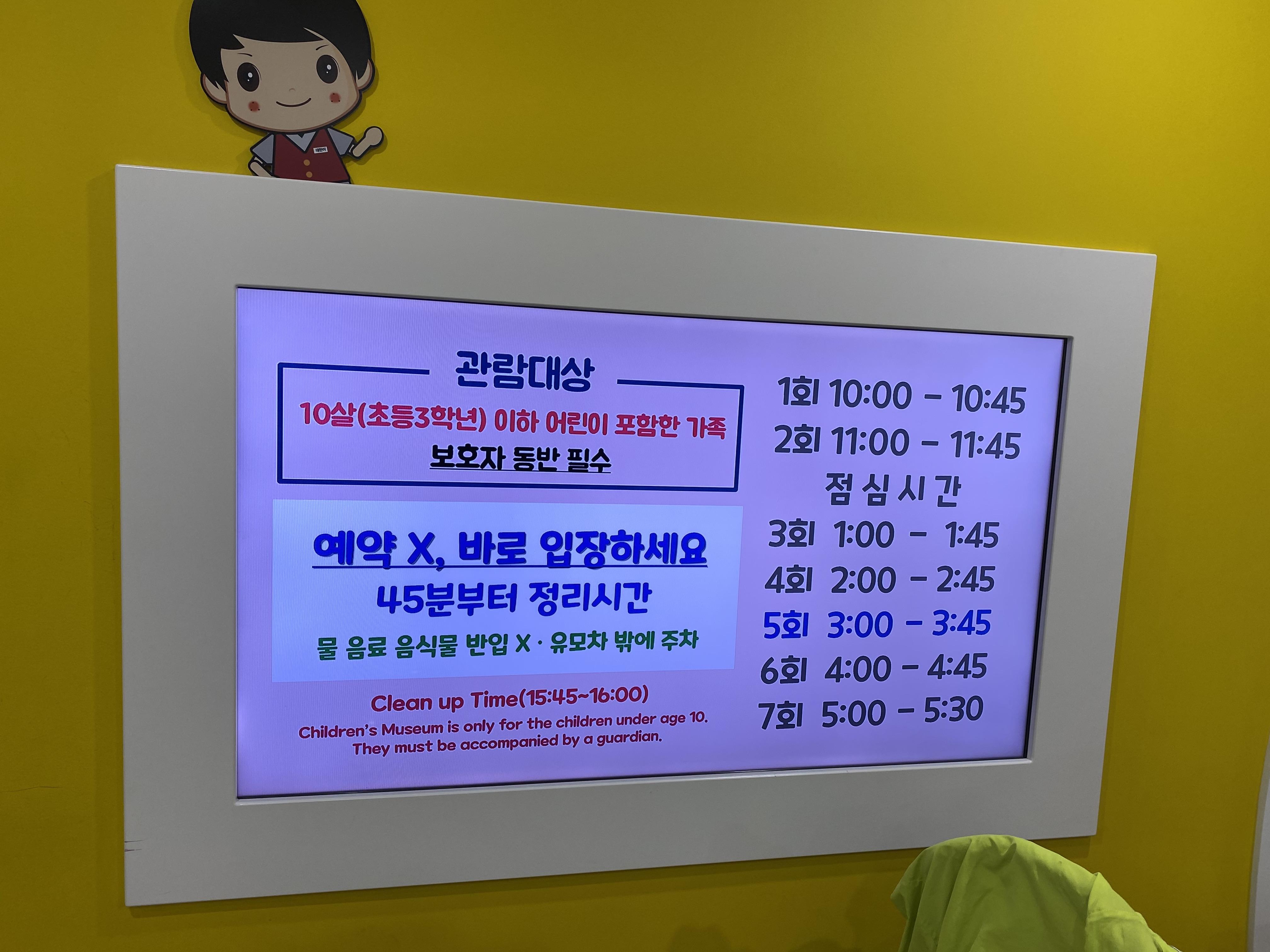 어린이박물관은 예약 없이 바로 입장이 가능하며 무료로 운영이 되고 있습니다. 입장 제한 나이는 10살(초등학생3학년) 이하 어린이만 입장이 가능하며, 보호자 동판은 필수 있습니다. 그리소 10:00부터 45분, 15분 휴식 단위로 운영이 되고 있습니다.