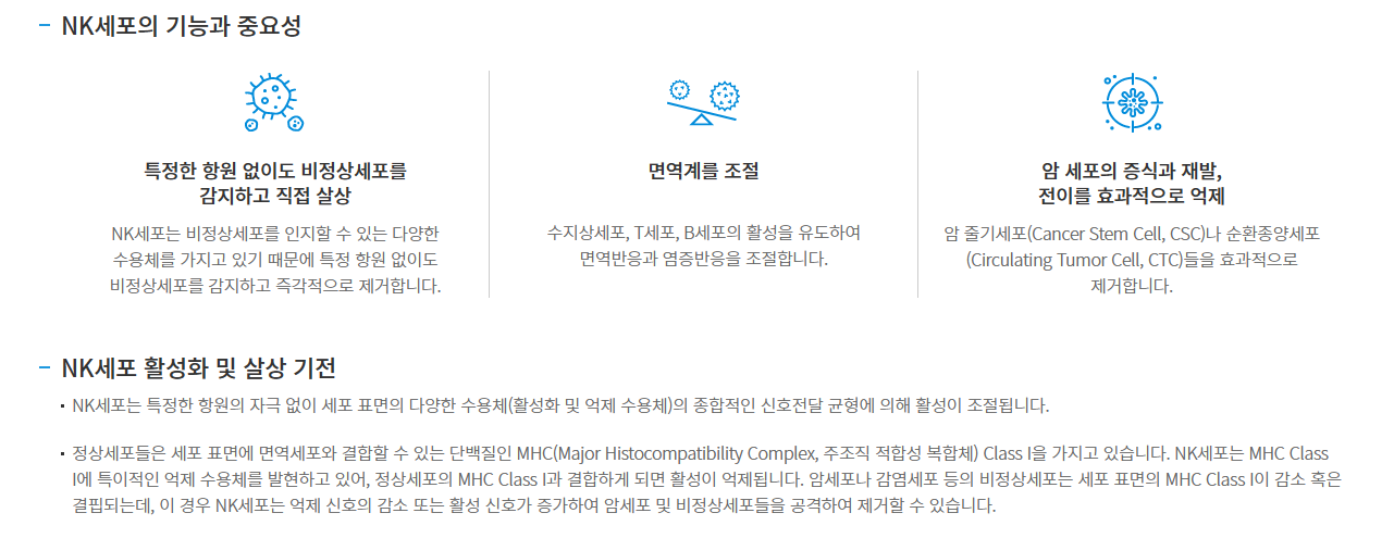 NK세포(자연살해세포, Natural Killer Cell) NK세포는 체내 1차 방어작용(선천면역)을 대표하는 면역세포입니다. 암세포나 바이러스 감염세포 등의 비정상세포를 스스로 감지하고 즉각적으로 제거합니다.