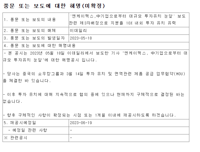 엔케이맥스는 중국 기업으로부터 대규모 투자유치 눈앞이라는 보도 관련으로 제삼자배정으로 지분율 10% 내외 투자유치 유력이라는 내용에 대해 구체적으로 결정된 바가 없다고 공시했습니다. 덧붙여 향후 구체적인 사항이 확정되는 시점 또는 1개월 이내에 재공시하도록 할 예정이며, 공시예정일은 6월 19일입니다.