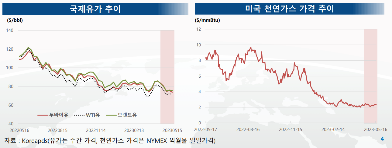 - 5월초 미연준의 기준금리 25bp(5.00~5.25%) 인상, 미정부 부채한도 협상 논란 확대, 미국 휘발유 재고 증가, 중국 경제 개선 지연 등으로 수요 둔화 우려가 가중되며 유가 하락