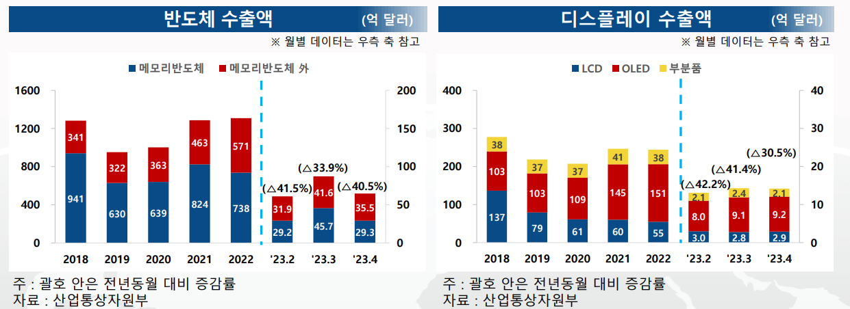 4월 반도체와 디스플레이 수출증가율, 각각 전년동월 대비 △40.5%, △30.5% 기록