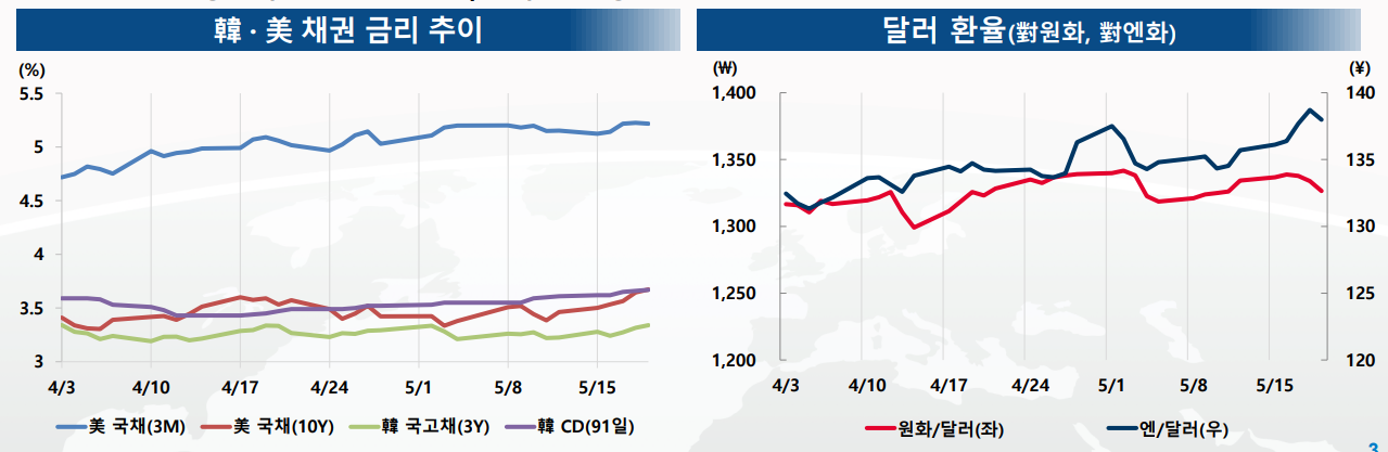 - 단기물인 미국채 3개월물은 미연준의 정책금리 인상으로 지속적인 상승세를 보이며 5.2%대를 기록(5.19)