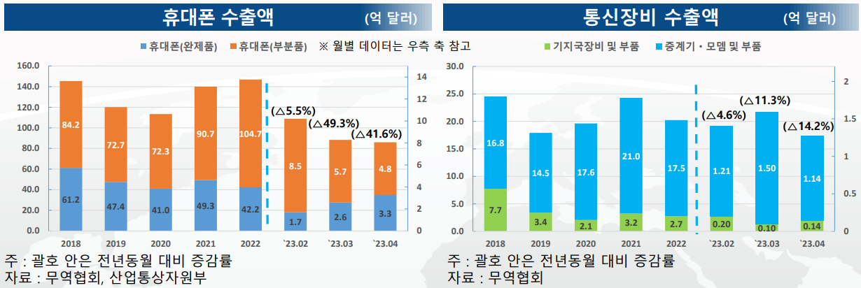 4월 휴대폰 수출액은 전년동월 대비 41.6% 감소, 통신장비 수출액은 14.2% 감소