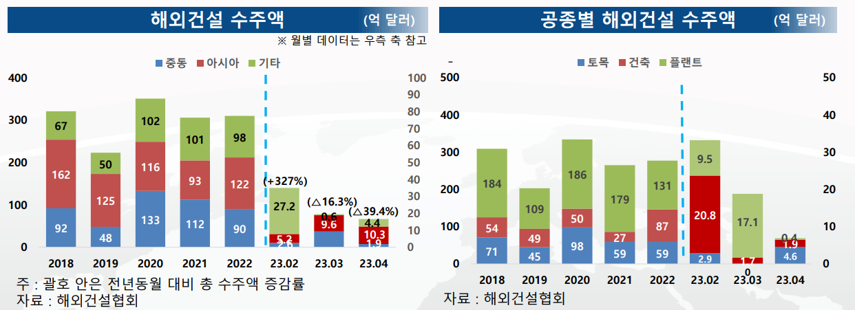 - 공종별 수주액은 플랜트 27.8억 달러(전년동월 대비 △22.1%), 건축 26.6억 달러(전년동월 대비 7.7%), 토목 8.3억 달러(전년동월 대비 △43.1%)를 기록