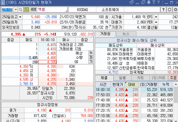 엑셈도 상승을 하고 시간외에도 좋은 모습을 보여주는 종목입니다.
