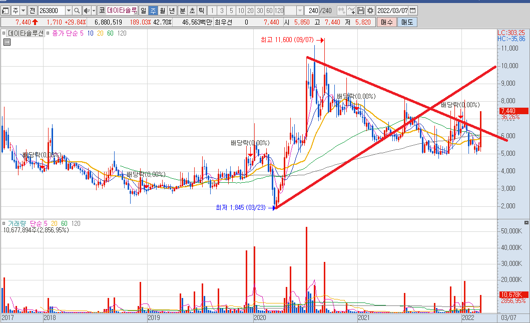 데이타 솔루션 주봉 차트는 저항대를 뚫는 상승세를 보여주었고,