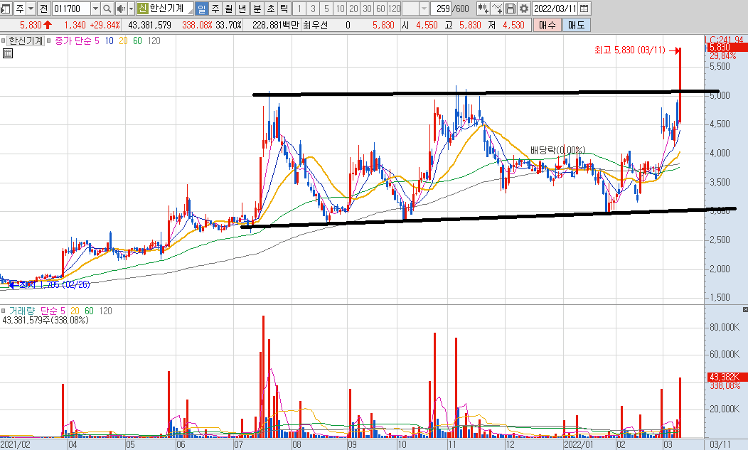 한신기계도 일진파워의 차트와 비슷하게 박스권을 뚫고 상한가에 마감을 했습니다.