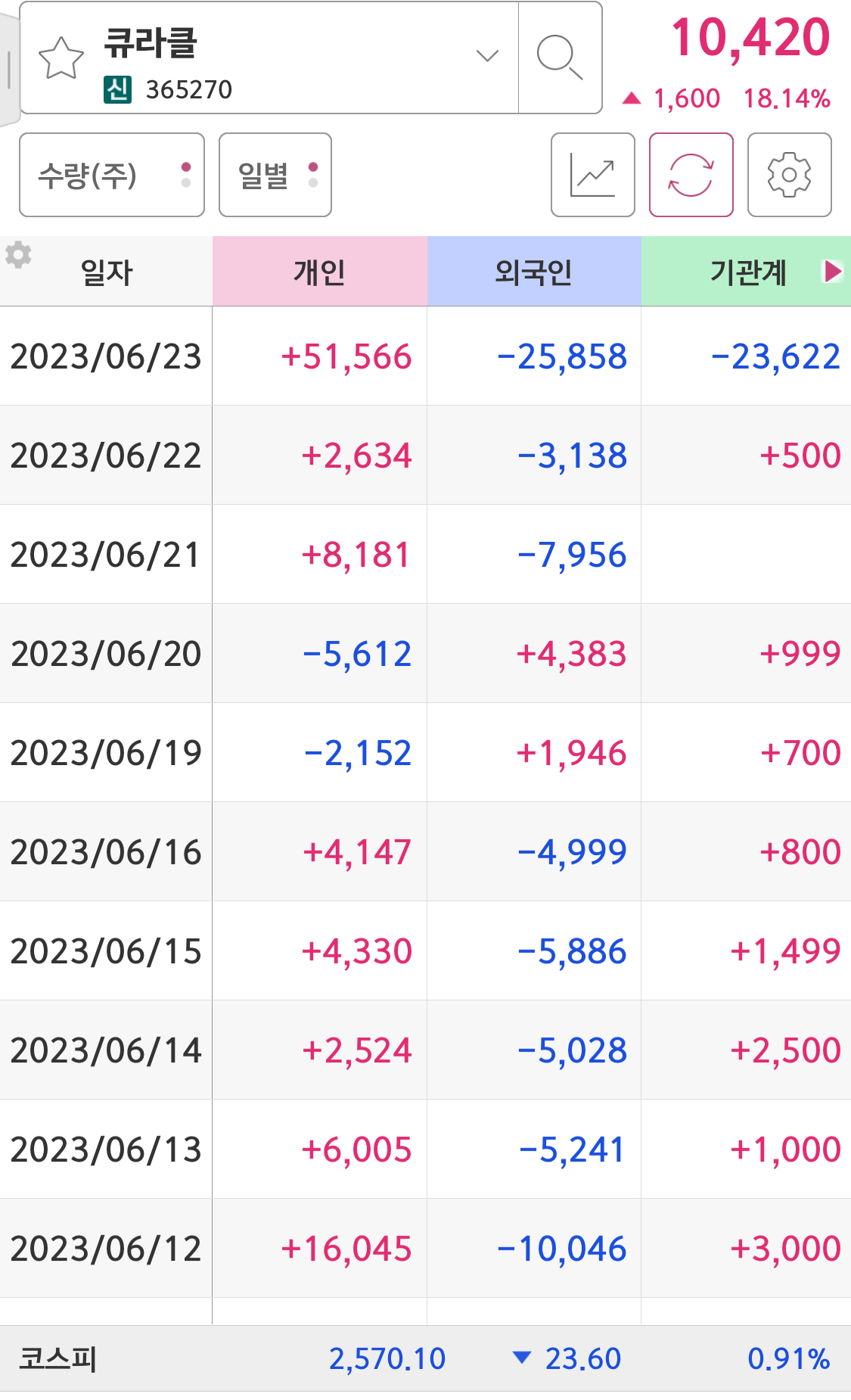 큐라클 3분봉 및 수급