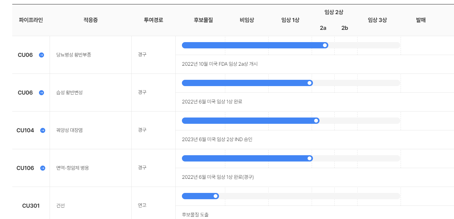 현재 미국에서 임상시험을 진행 중입니다. 또한, CU01은 당뇨병성 신증치료제로, 2023년 1월에 임상 2b상 시험을 시작하였습니다. 또한, 경구용 습성 황반변성치료제인 CU03은 2022년 1월에 국내 임상 2a상 시험이 완료되었습니다.