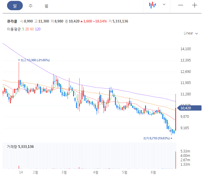 안녕하세요 벨카입니다. 주식시장에서 많은 거래대금으로 바닥권에서 장대양봉을 만든 큐라클을 분석하는 포스팅을 하도록 하겠습니다.