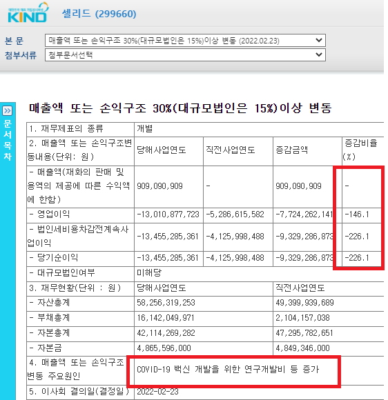 셀리드 2021년 사업보고서 매출액 변동 공시를 보면은