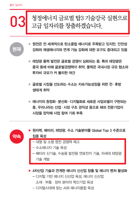 윤석열 대통력 공약인 좋은 일자리 03번에 청정에너지 글로벌 탑3 기술강국 실현으로