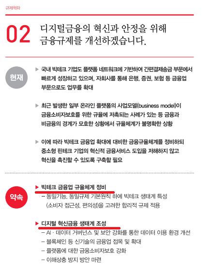 개선하겠다고 공약했으며, 내용으로는 빅테크 금융업 규율체계 정비,