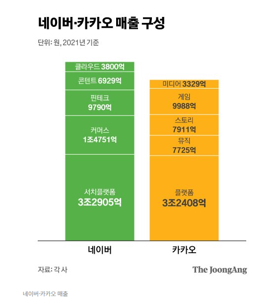현재 네이버와 카카오의 주요 매출 구성을 보면 네이버가 더 큰 것으로 나타나고 있습니다.