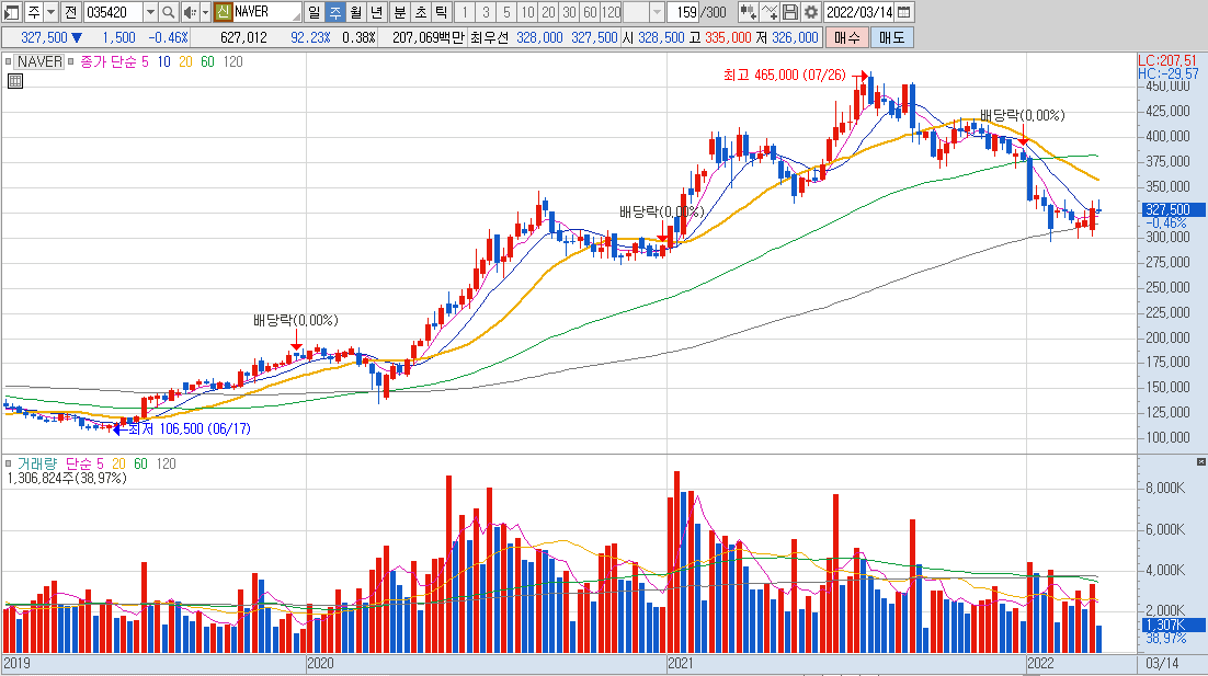 네이버와 카카오의 주봉 차트를 보시면 어느 정도 커플링 현상과 같이 비슷하게