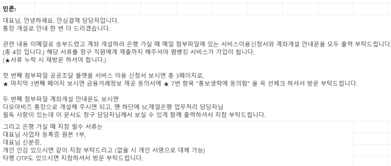 먼저 이메일로 필요한 서류를 전부 보내줍니다. 잘 읽어보고 SC제일은행 가서 통장을 만드셔야 입금을 받을 수 있습니다. SC제일은행에서 잘 모를 수 있으니 잘 숙지하고 가셔야 대응을 할 수 있습니다. 저는 다행히 SC제일은행 직원이 인콘 통장을 만든 경험이 있어서 순조롭게 진행할 수 있었습니다.