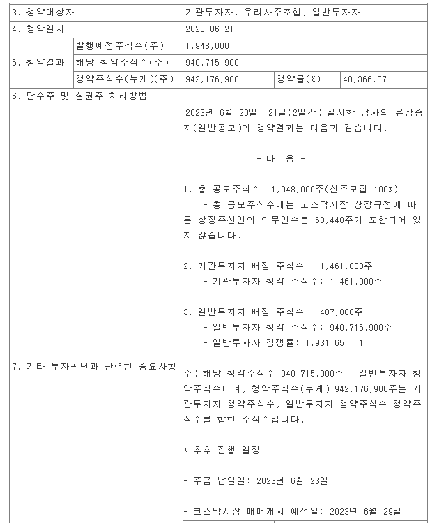 총 공모주식수 1,948,000주 / 기관 투자자 배정 주식수 1,461,000주 / 일반투자자 배정 주식수 487,000주입니다.