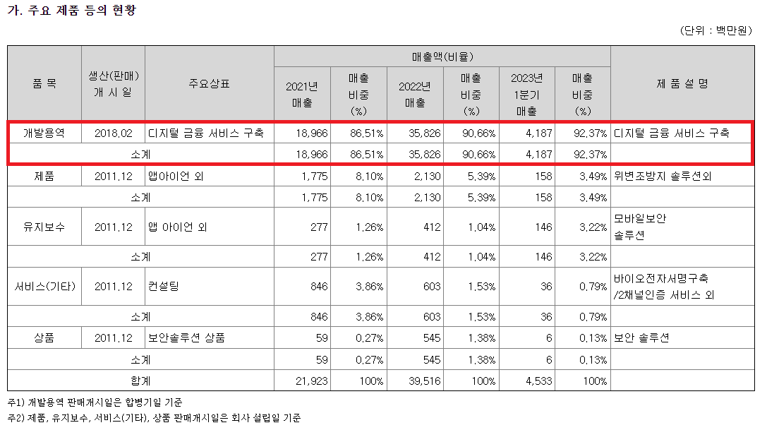 주요 제품 등의 현황을 보시면 대부분의 매출이 디지털 금융 서비스 구축에서 발생하고 있습니다. 매출 비중이 92.37%인 거 보면 디지털 금융 서비스 구축사업이 주력인걸 확인할 수 있습니다.