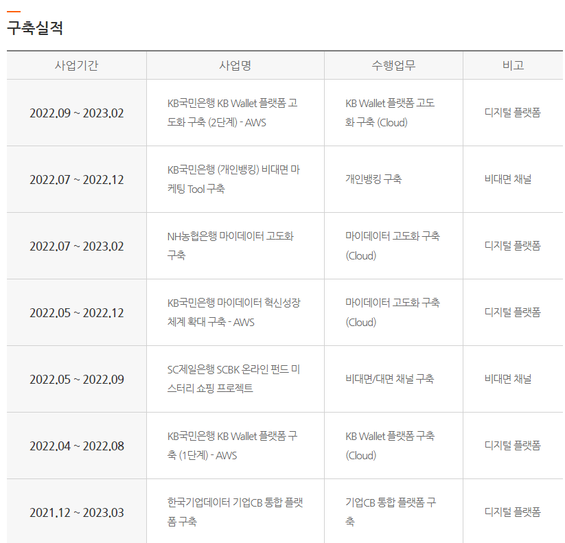 구축 실적을 보면 KB국민은행, NH농협은행, SC제일은행, 한국기업데이터 등 다양한 금융기관의 사업을 진행했습니다.