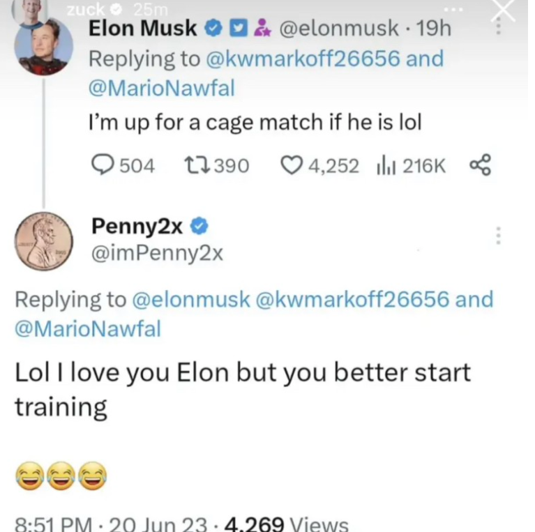 이에 일론 머스크는 열받아서 "나는 철창에서 한 바탕 붙을 준비가 되어 있다"라고 다시 댓글을 달면서 대결의 신청이 된 것입니다. 이 대화를 본 마크 저커버그가 "위치 보내라"라고 인스타그램에 올리자 일론 머스크가 "라스베이거스 옥타곤"이라고 트위터를 날리면서 대결이 시작됬습니다.