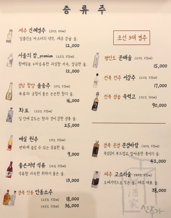선주가의 메뉴는 돔베고기, 돌문어 숙회, 한우육회, 쭈꾸미무침, 숙성 회 등 다양하게 있으며, 처음 보는 증류주도 많이 있습니다. 아무래도 선주가의 대표 메뉴는 제철 모둠회입니다. 저희는 제철메뉴를 주문했습니다.