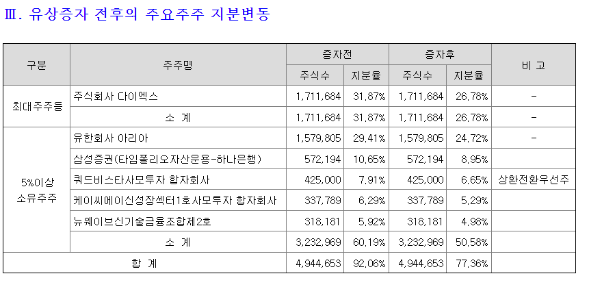 알멕은 상장하면서 최대주주가 주식회사 다이엑스가 26.78%를 보유하고 있습니다. 그밖에 5% 이상 소액주주로 유한회사 아리아, 삼성증권, 쿼드비스타사모투자 합자회사, 케이씨에이신성장섹터1호사모투자 합자회사, 뉴웨이브신기술금융조합제2호가 주주로 등록이 되었습니다.