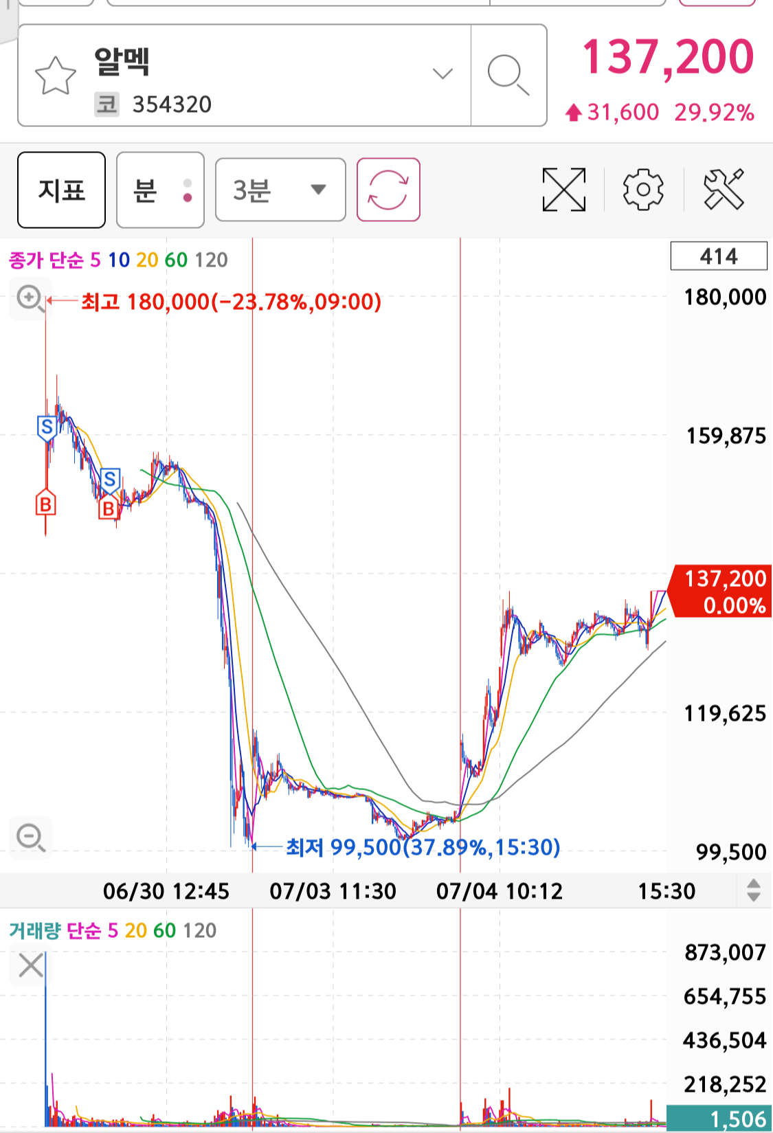 사실 알멕이 상장했을 당시 장초반에 빠르게 단기 트레이딩으로 수익을 보고 나왔습니다. 그리고 오늘 오후에 상한가로 잘 마감을 했으며 시간 외 거래에서도 잘 마감을 했습니다. 7월 5일에는 어느 정도 갭을 뛰우면서 상승을 하면 저항구간이 많아서 바로 하락할 수 있을 수 있습니다.