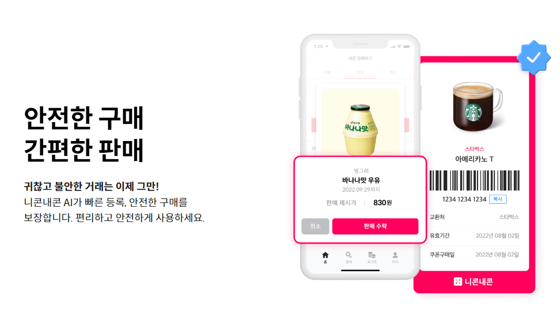 니콘내콘은 안전하고 간편하게 거래를 할 수 있습니다. 핸드폰 소액결제, 카드결제, 니콘내콘포인트 결제를 통해서 구매를 할 수 있습니다. 구매를 하면 위 사진과 같이 바코드 사진이 제공됩니다. 그리고 매장에서 바코드를 통해서 주문을 할 수 있습니다.