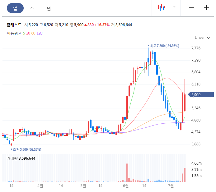 일봉차트를 보시면 상승분을 다시 되돌렸다가 최근 반등을 한 모습입니다. 솔직히 홈캐스트는 세력의 마음으로 움직일 수 있는 종목이어서 패스하는 것이 좋아 보입니다.