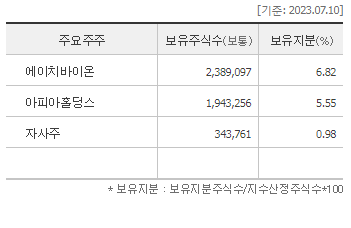 전 임원이 장중에 전량 매도했는 공시가 나왔으며, 주요주주 현황을 보면 에이치바이온이 6.8%, 아피아홀딩스가 5.5%를 보유하고 있습니다. 사실 이는 주요 주주가 없는 상태이라고 볼 수 있으며, 굉장히 위험한 상태의 지배구조입니다.
