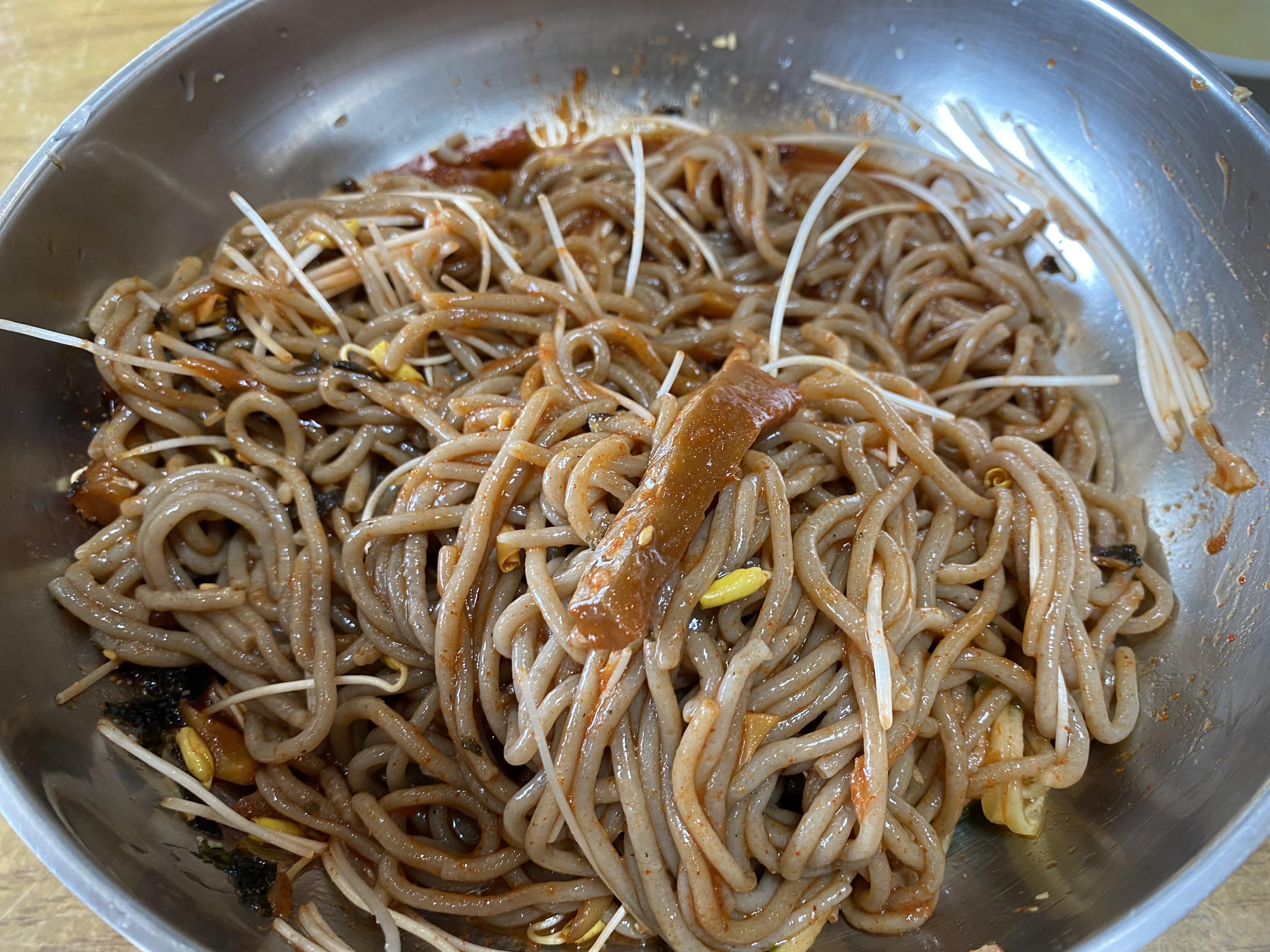 메밀면의 상태가 정말 탱글탱글하고 신선했습니다. 메밀싹과 양념장이 잘 비벼주면 맛있어 보이는 비빔막국수가 완성됩니다.