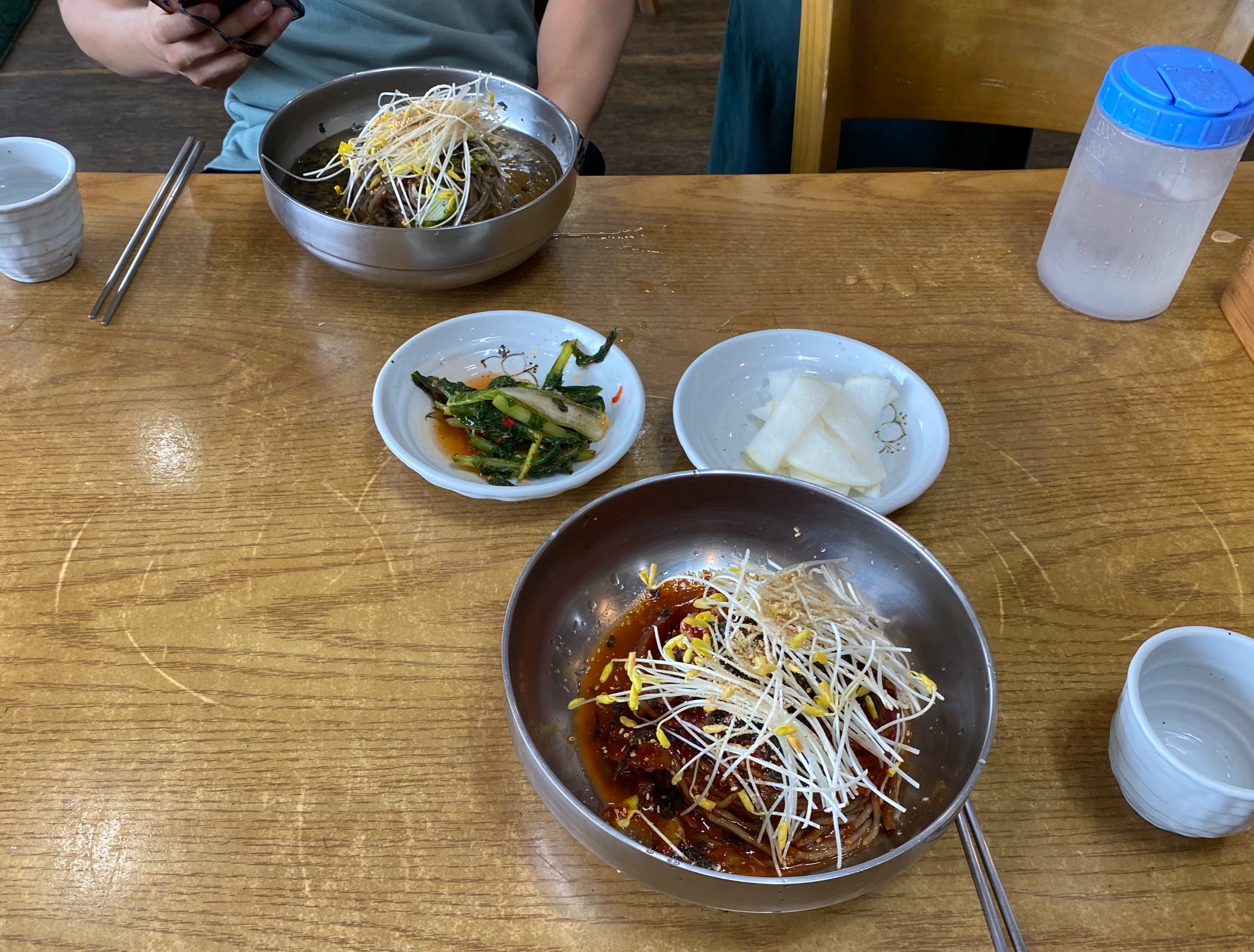 주문하고 한 5분정도 뒤에 바로 주문했던 메뉴가 나옵니다. 기본반찬도 심플하게 열무김치와 무가 나왔습니다. 메밀막국수 위에 올라간 게 무엇인지 궁금해서 사장님께 여쭤보니 메밀싹이라고 말씀해 주셨습니다.