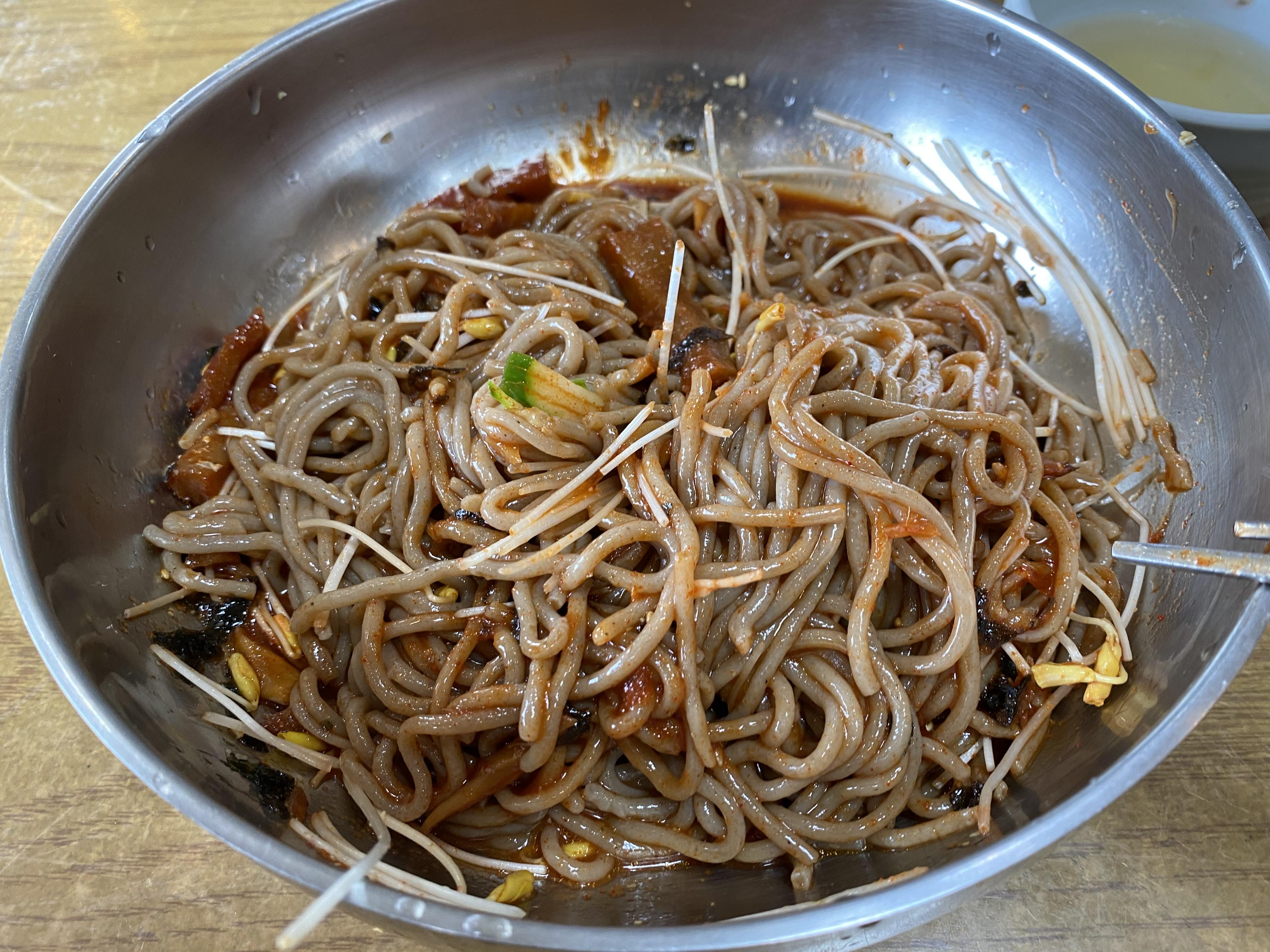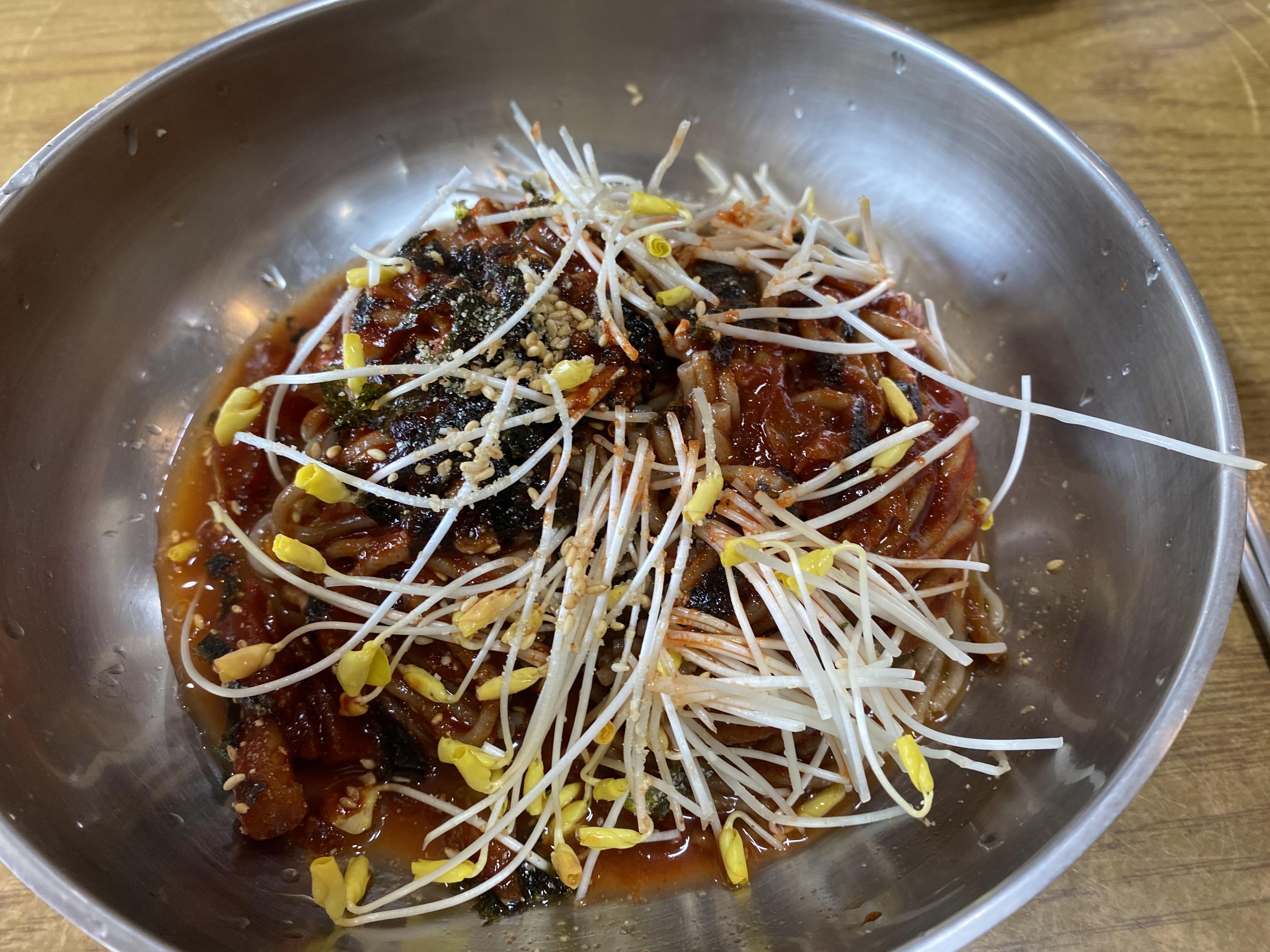 메밀면의 상태가 정말 탱글탱글하고 신선했습니다. 메밀싹과 양념장이 잘 비벼주면 맛있어 보이는 비빔막국수가 완성됩니다.