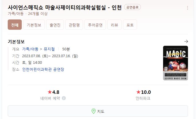 네이버에서 "마술사 제이티"를 검색하시면 공연정보를 확인할 수 있습니다. 인천어린이과학과에서 공연하는 일정은 7/8~7/16로 현재는 공연이 종료된 상태이지만 나중에 가까운 지역에서 공연을 하게 되면 아이와 함께 꼭 한번 보는 것을 추천드립니다.