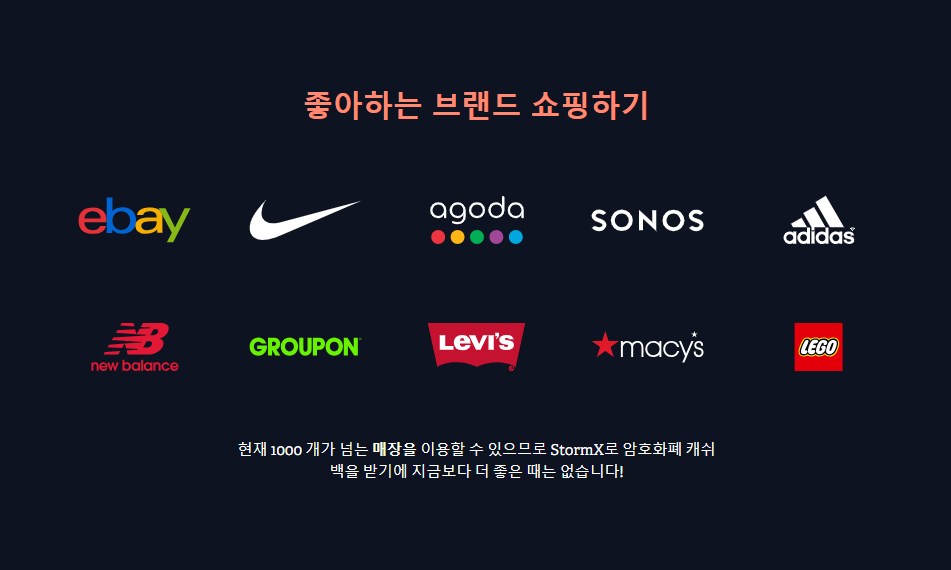 스톰엑스는 비트코인, 이더리움 등의 암호화폐 자산을 쇼핑과 연계하여 캐시백을 받을 수 있는 서비스를 제공하는 플랫폼입니다. 스톰엑스 사용자는 익스피디아, 나이키, 이베이, 아고다, 아디다스등 천여 개가 넘는 매장을 이용을 한 뒤 암호화폐로 캐시백을 받을 수 있는 플랫폼입니다. 즉 OK 캐시백처럼 100개가 넘는 쇼핑몰을 이용하고 캐시백을 포인트가 아닌 비트코인 등의 디지털 자산으로 받을 수 있는 겁니다.