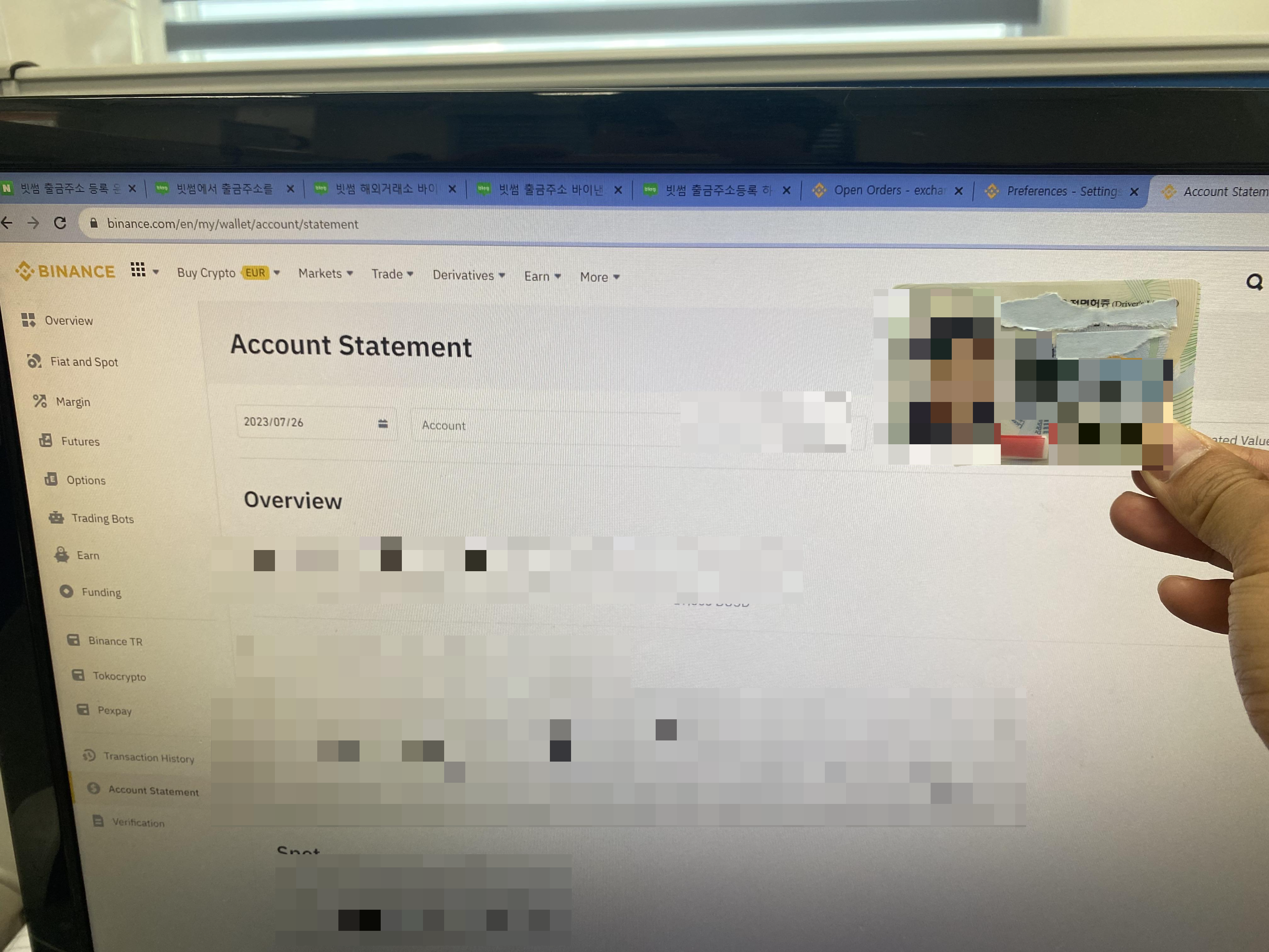 위 내용과 같이 마스킹을 하고 바이낸스 홈페이지 로그인 후 Acount Statement 창을 찾아서 동시에 찍으셔야 합니다. 그리고 지갑주소가 보이는 사진도 같이 찍어서 2개의 사진을 등록해 주셔야 승인이 됩니다.