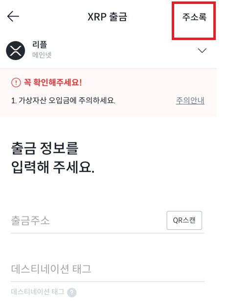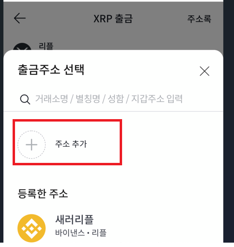 그리고 오른쪽 상단의 주소록 버튼을 누르고 주소추가를 누르시면 됩니다. 바이낸스 리플주소등록을 하려고 합니다. 왜냐하면 바이낸스 리플 주소가 유효기간이 다되어서 변경이 되었더라구요. 그래서 바이낸스 리플 새로운 지갑주소를 등록했습니다.